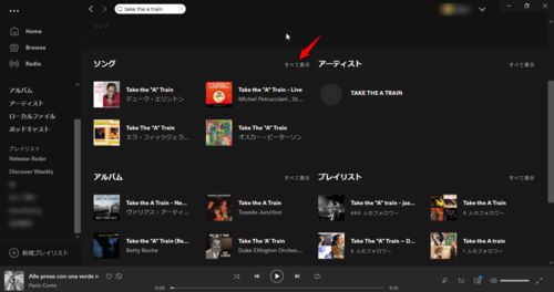 検索結果をSpotifyの「プレイリスト」に入れてから、そのプレイリスト内で並び替えることができます。 手順は下記のとおりです。 検索フォームにキーワードを入力して、検索結果の右上にある「すべて表示」をクリック。 ("take the a train"の検索結果) 検…