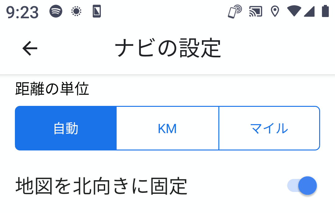 2020-07-09 最終更新日 2024-08-12 Googleマップのアプリでナビ中に地図の向きを北向きに固定する方法 Android iPhone Googleマップのアプリでナビ機能を使用中に、地図の向きをノースアップ(北が上になる向き)に固定する手順を紹介します。 ここで紹介するのはGoogleマップのAndroidアプリの場合の手順ですが、iOSアプリでもおそらく同じ手順で実行できると思います。 Googleマップのアプリを開き、検索フォームの右端にある自分のアカウントのアイコンをタップ。*1 次の画面で、「設定」をタップ。 次の画面で、「ナビの設定」をタップ。 次の画面で、「地図を北向きに固定」をオンにします。 以上です。 *1:Googleマップのアプリにログインしていない時でも、手順は同じです。