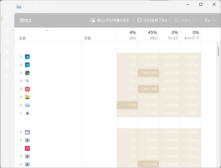 Windows 11 22H2において、例えばタスクマネージャーでは、ウィンドウの左端にアイコンが縦に並んでいるはずなのですが、このように真っ黒(または真っ白)になって見えなくなっている場合があります。