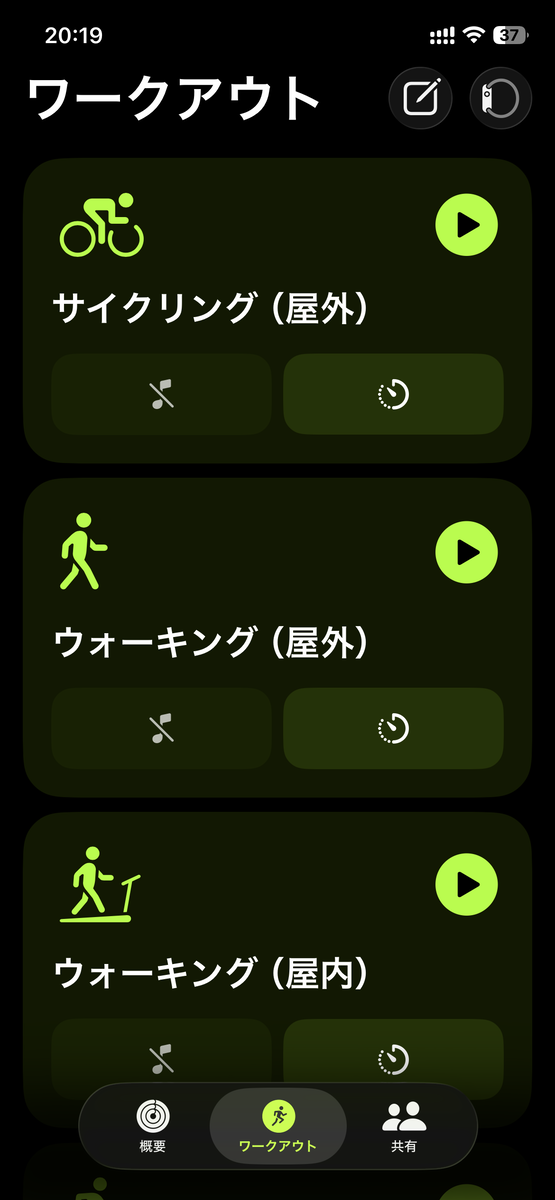 青字で「ウォーキング(屋外)」などと書いてあるのは、ワークアウトの種目(スポーツの種目)です。