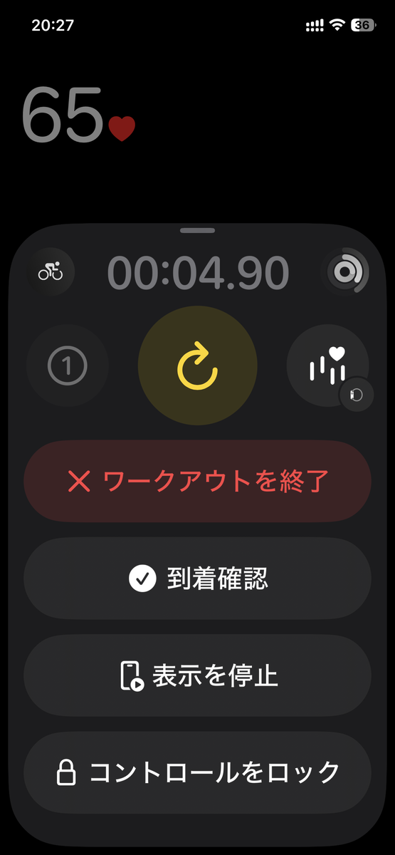 ワークアウトを終了させるアイコンを押した場合は、特に音などは鳴りません。上述のチェックマークが画面に出れば、終了しています。